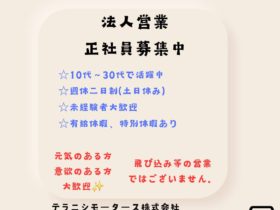 皆さん、こんにちは✨ テラニシモータース株式会社です🚗³₃ テラニシモータースでは、現在法人営業の 正社員を大募集しております!! 法人営業とはいえど、飛び込み…